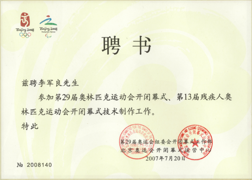 2008第二十九屆北京奧運(yùn)會(huì)、殘奧會(huì)聘書-李軍良