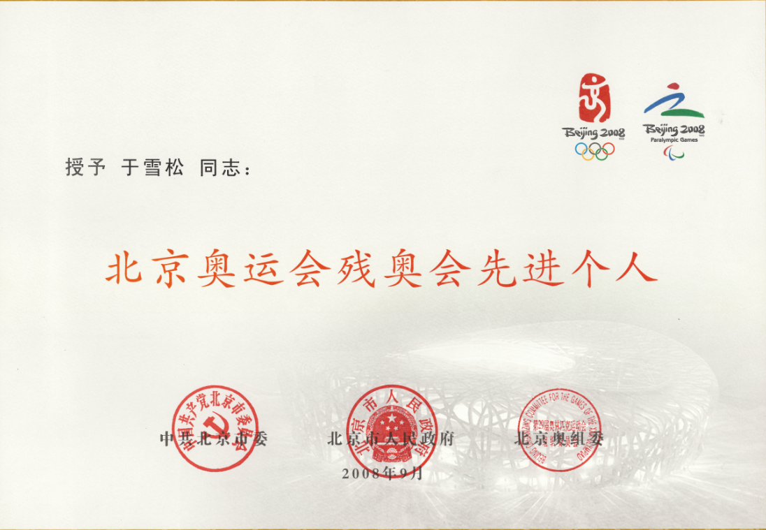 2008北京奧運(yùn)會(huì)、殘奧會(huì)先進(jìn)個(gè)人榮譽(yù)證書-于雪松