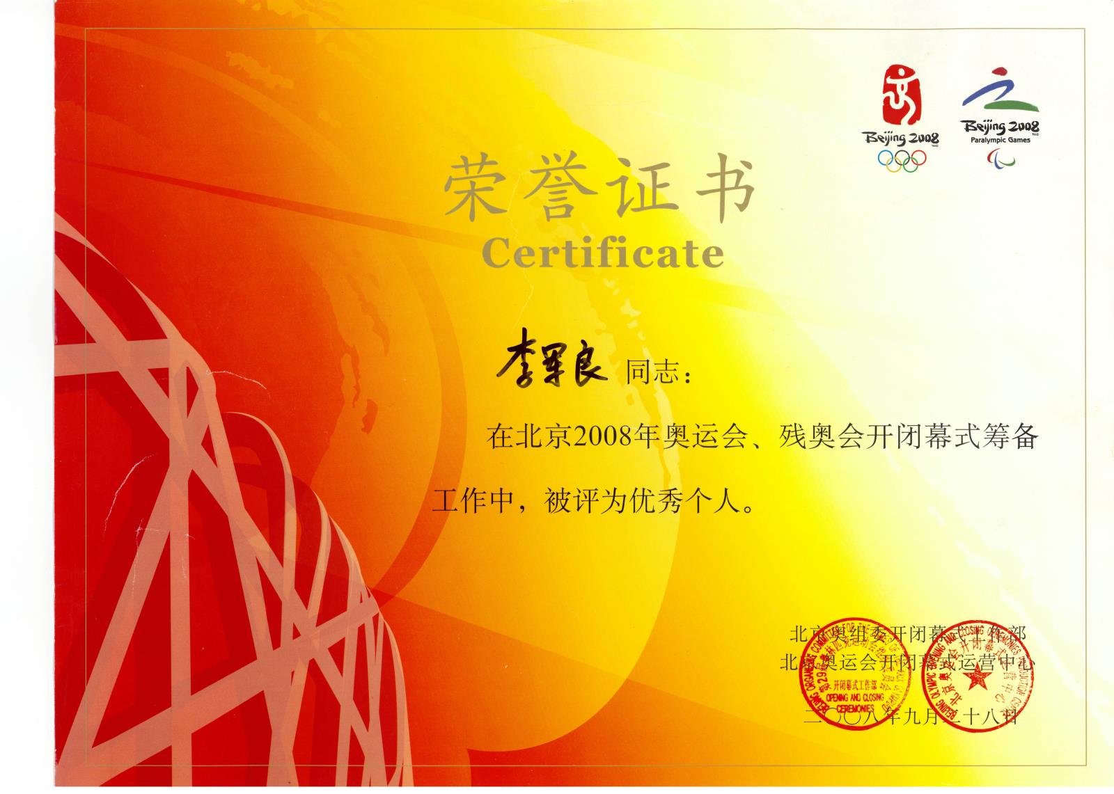 2008北京奧運(yùn)會(huì)、殘奧會(huì)優(yōu)秀個(gè)人榮譽(yù)證書-李軍良