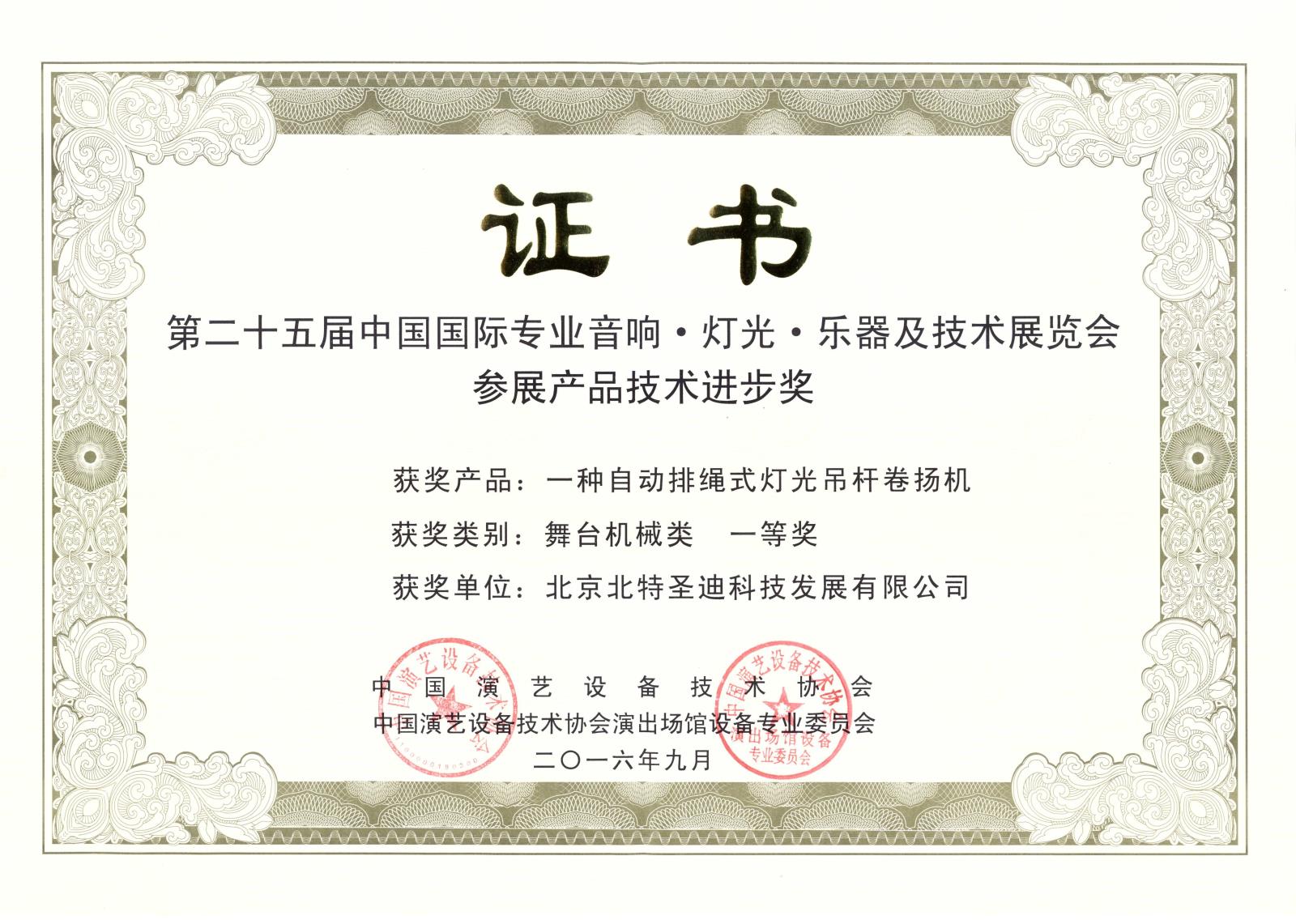 2016第二十五屆PALM展產(chǎn)品技術(shù)進(jìn)步獎(jiǎng)-一種自動(dòng)排繩式燈光吊桿卷揚(yáng)機(jī)-舞臺(tái)機(jī)械一等獎(jiǎng)