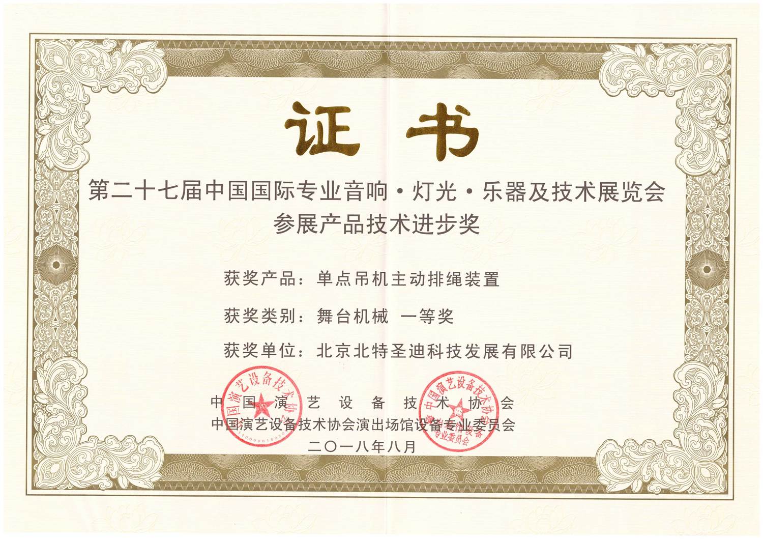 2018第二十七屆PALM展產(chǎn)品技術(shù)進(jìn)步獎(jiǎng)-單點(diǎn)吊機(jī)主動(dòng)排繩裝置-舞臺(tái)機(jī)械一等獎(jiǎng)