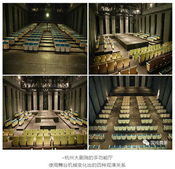 以杭州大劇院的多功能廳為例,杭州大劇院多功能廳的座椅全部藏在可旋轉(zhuǎn)式臺倉下。當(dāng)需要某一塊空間變成觀眾席時,座椅從臺倉下翻轉(zhuǎn)出來,通過不同的空間布局形成五種變化模式:第一種是平面大廳式的,沒有座椅;第二種是終端式舞臺,圍繞著舞臺另一側(cè)布滿觀眾席;第三種是三面觀眾的舞臺;第四種是觀眾席被演區(qū)包圍的四面觀眾舞臺;第五種是形成T型舞臺的空間結(jié)構(gòu),可以說是非常靈活多變的。同時除了地面部分靈活多變的觀眾席座椅以外,為了適應(yīng)多功能廳演區(qū)多變的演出環(huán)境,劇場頂部采用的是可移動的短桿,給予設(shè)計師創(chuàng)造空間使用的更多可能行。