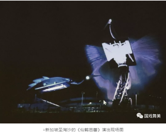 在新加坡圣淘沙的《仙鶴芭蕾》中,由機械裝置及l(fā)ed屏幕構(gòu)成的巨大仙鶴在空中翩翩起舞,配合燈光、視頻、水效表現(xiàn)其談情說愛的浪漫場景。根據(jù)水壓的不同,水效產(chǎn)生的變化弧線象征性地表現(xiàn)出了仙鶴翅膀的擺動,同時又避免了機械式翅膀帶來的笨重感。