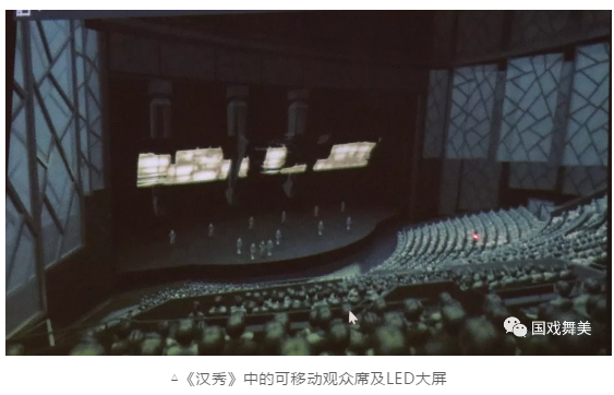萬達集團制作的《漢秀》,由三塊液壓傳動控制的、可俯仰、旋轉(zhuǎn)的LED大屏配合可旋轉(zhuǎn)、升降觀眾席形成兩種不同觀演模式:一種是觀眾全正面面向舞臺,另一種是正面與側(cè)面的結(jié)合。