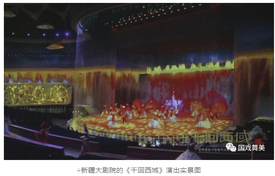 在新疆大劇院的《千回西域》中,大量空中威亞的運用,使演員可以到達表演區(qū)的任何地方;升降臺與水臺的使用,將真實的水效場景搬到劇場里面;為馬奔跑而研制的跑馬機,能將馬奔跑的絕對距離和相對速度限定在某一相對空間中;可以變化出不同圖案及文字的水幕造型機,則是一種既浪漫又富有功能性的舞臺機械裝置。