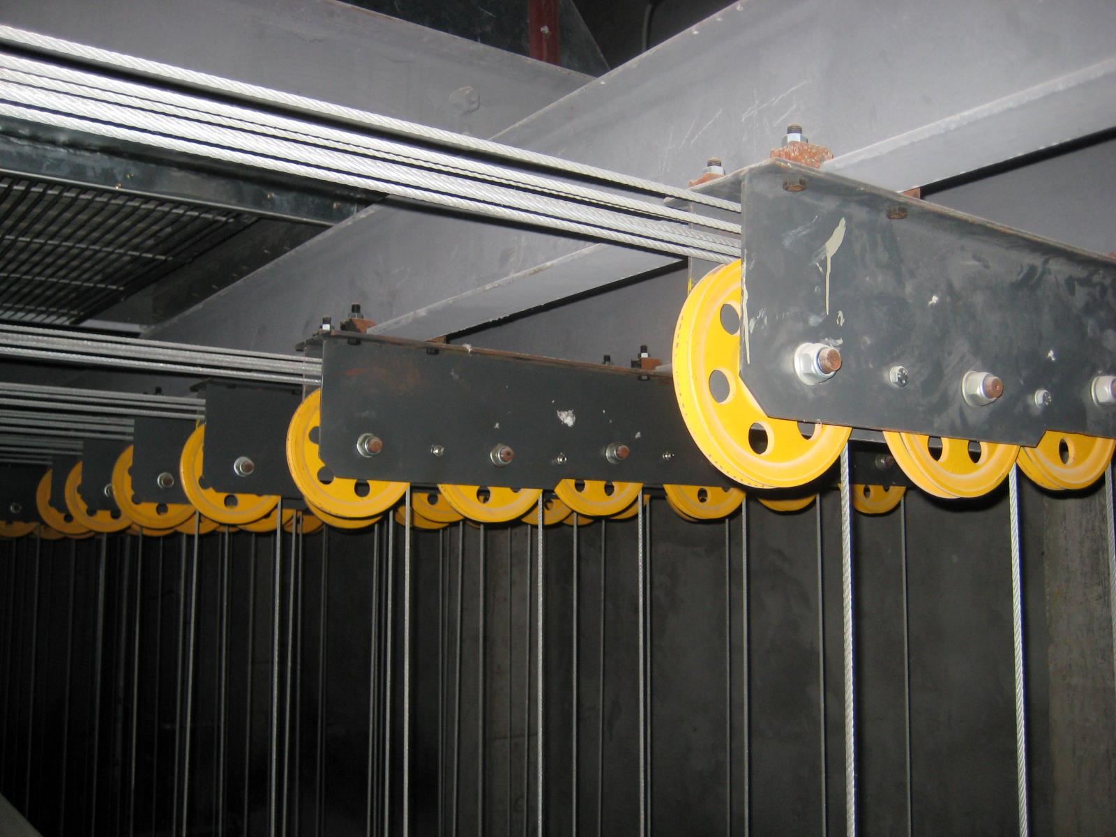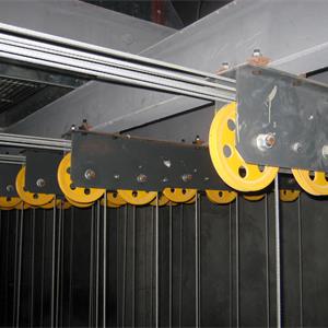 卷揚(yáng)系統(tǒng):包括電動(dòng)機(jī)、減速器、雙制動(dòng)器、卷筒、滑輪組件、鋼絲繩和配件、輔助操作手輪等。滑輪組件(一般)包括拐角滑輪、吊點(diǎn)滑輪。
