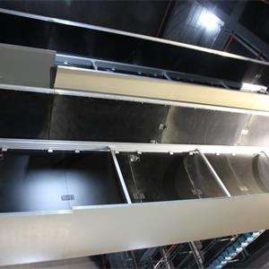 2.音樂罩的體形空間可調(diào);整個反聲罩分為:頂板(或叫上片、上板)、側(cè)板(或叫側(cè)片、側(cè)反射塔)及后板(或叫背板、后反射塔)三部分,其中頂板、側(cè)板和后板平時都存儲于后舞臺后部區(qū)域,用時頂板懸掛在吊桿上;側(cè)板及后板分高度不等的單塊存放在后舞臺后部或其他區(qū)域(如上海大劇院有位于品字型舞臺區(qū)外的反聲罩專用儲存空間),使用時手動推至主舞臺上工作位置。