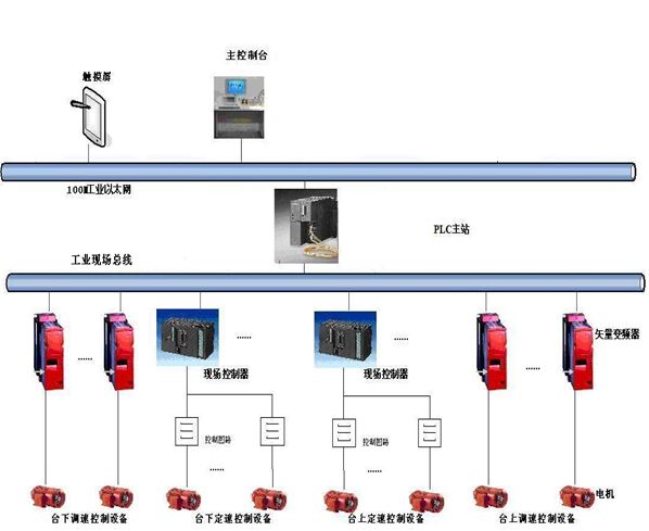 舞臺(tái)機(jī)械控制系統(tǒng)網(wǎng)絡(luò)包括:工業(yè)以太網(wǎng)和工業(yè)現(xiàn)場(chǎng)總線。前者用于上位機(jī)和PLC之間的數(shù)據(jù)交換;后者用于PLC和現(xiàn)場(chǎng)分布式從站及變頻器間收發(fā)命令、反饋狀態(tài)。整個(gè)系統(tǒng)網(wǎng)絡(luò)結(jié)構(gòu)大致如圖所示。