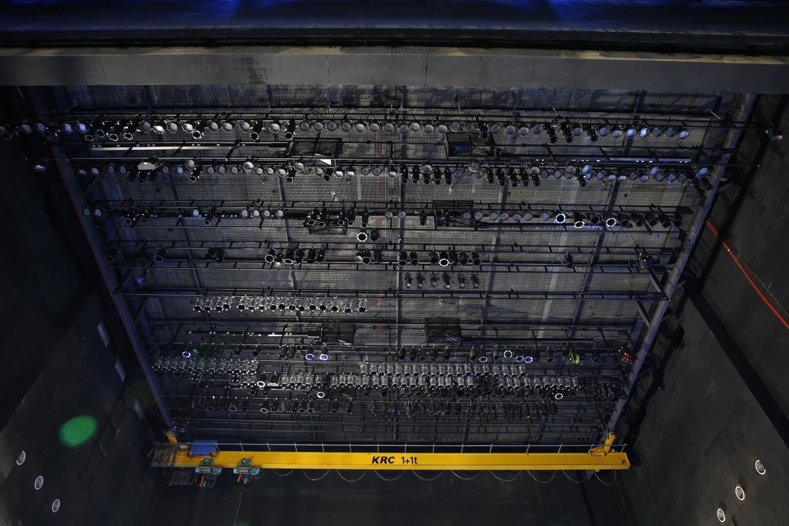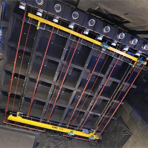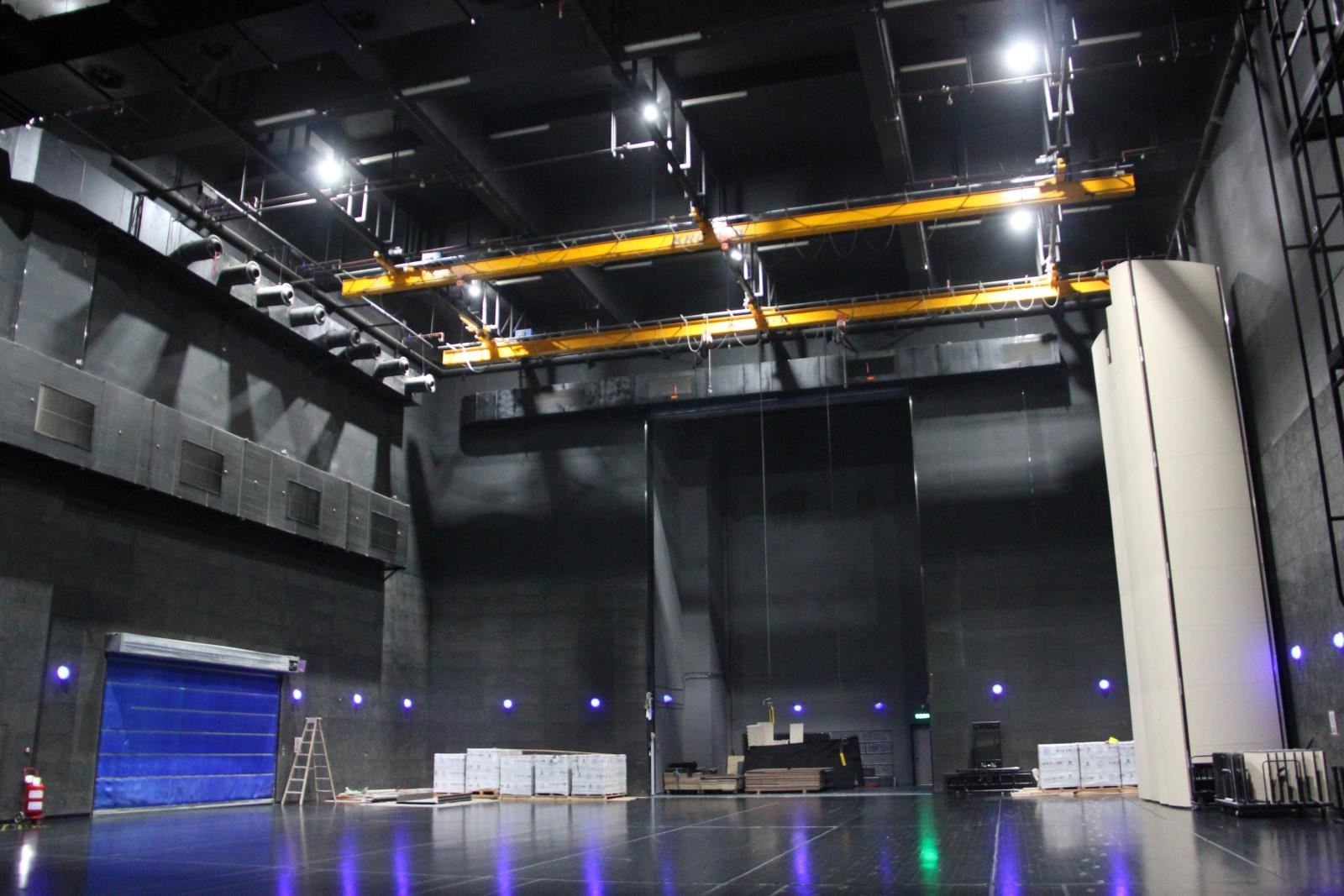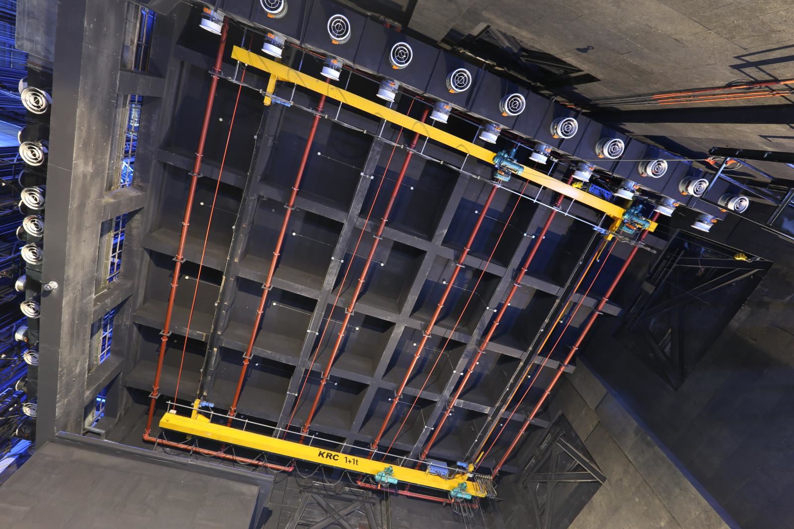 側(cè)臺裝景行車位于左右兩側(cè)側(cè)舞臺上空。行車用于大型或重型布景部件的裝配。